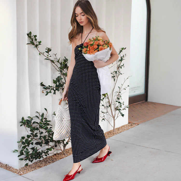 Metallic Textured Halter Dress in Black