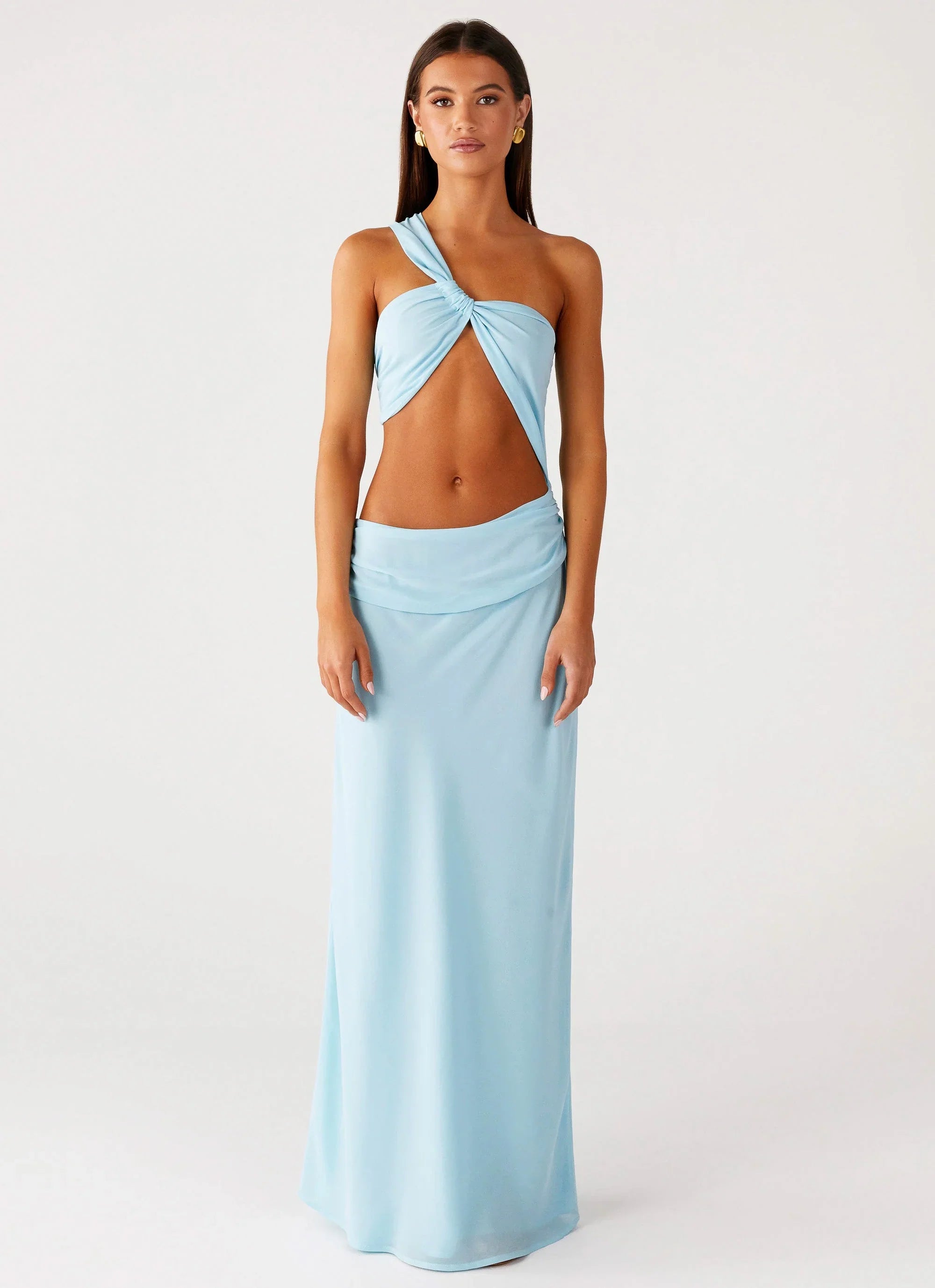 The Cindelle One Shoulder Maxi Dress is made for nights that captivate with modern elegance. Featuring an asymmetrical neckline with silicone taping and adjustable front ruching, this fully lined maxi dress is detailed with side waist ruching, a front cut-out, and a side skirt slit for sultry movement.