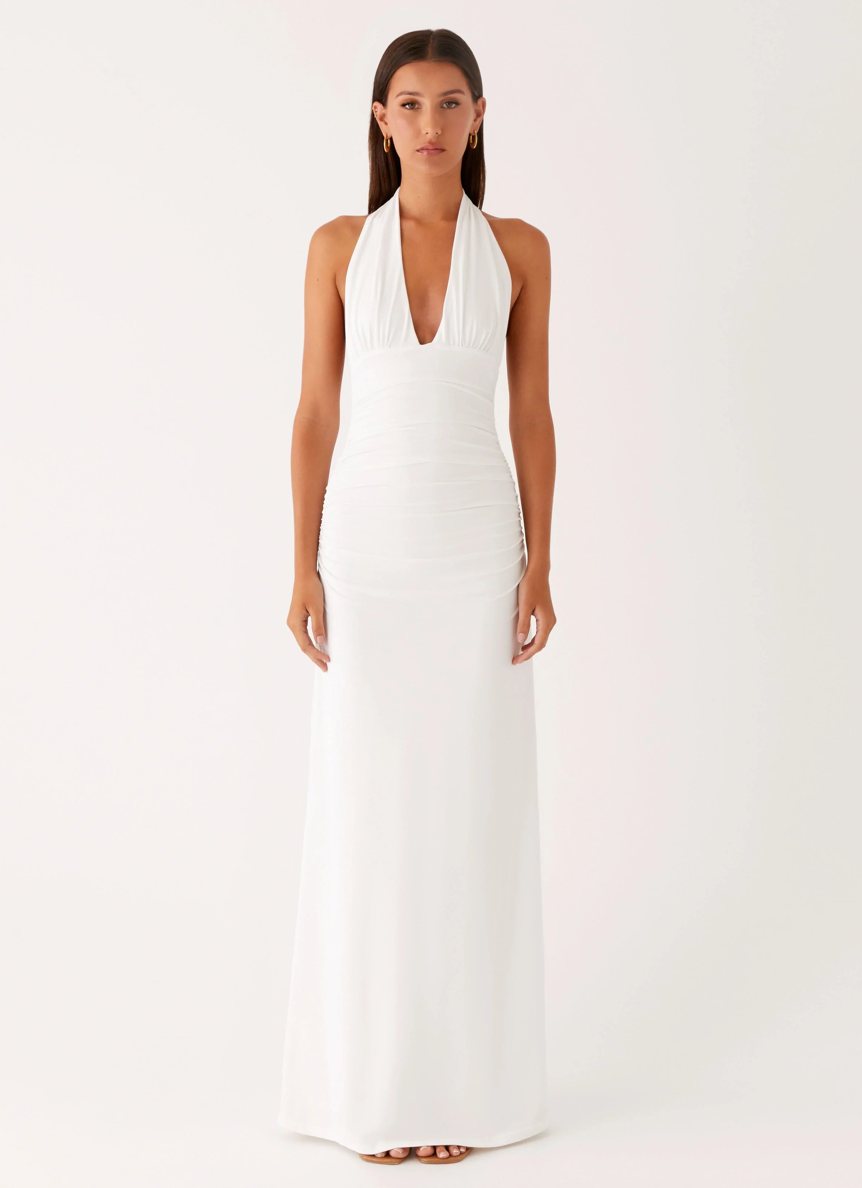 The Ilaria Halter Maxi Dress is your statement piece for nights that linger. Featuring a V neckline with a thick neck tie strap and back tie detail, this figure-hugging style is designed in stretch jersey with ruched underbust and side detailing. Fully lined with a low back, it’s made to turn heads after dark.
